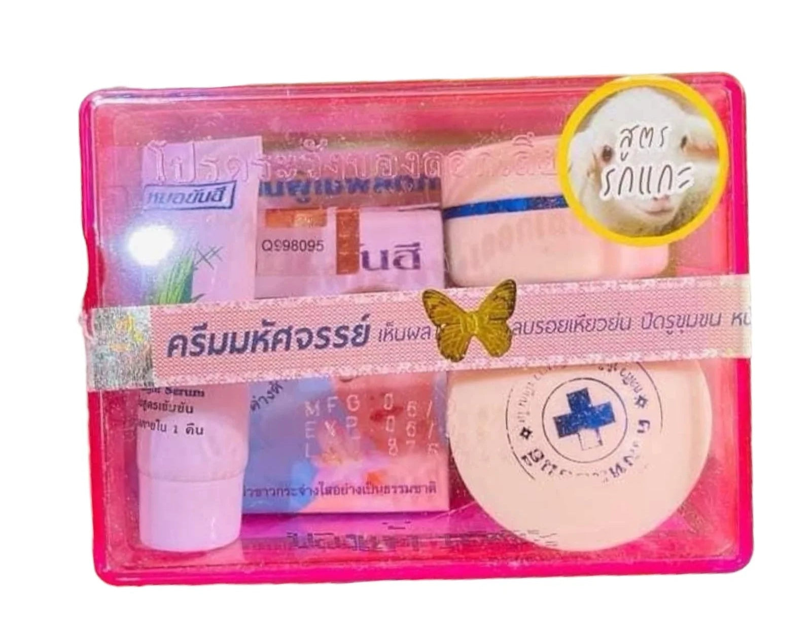 The set is formulated with ingredients like grape seed extract and glutathione to lighten skin tone and reduce the appearance of dark spots.